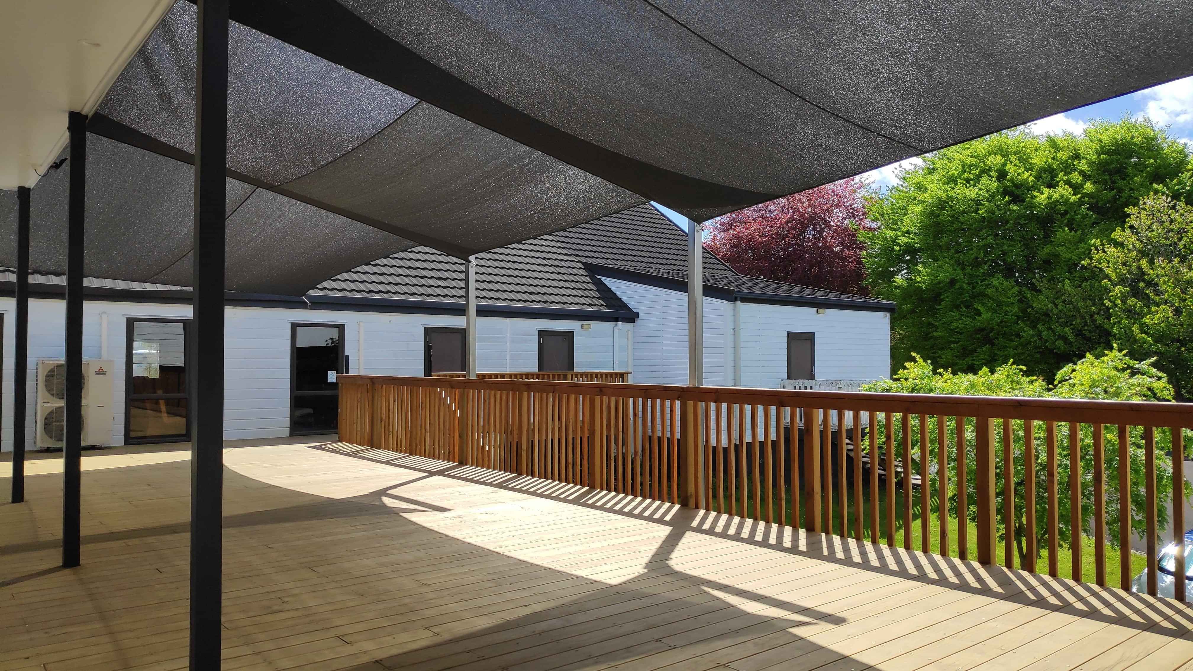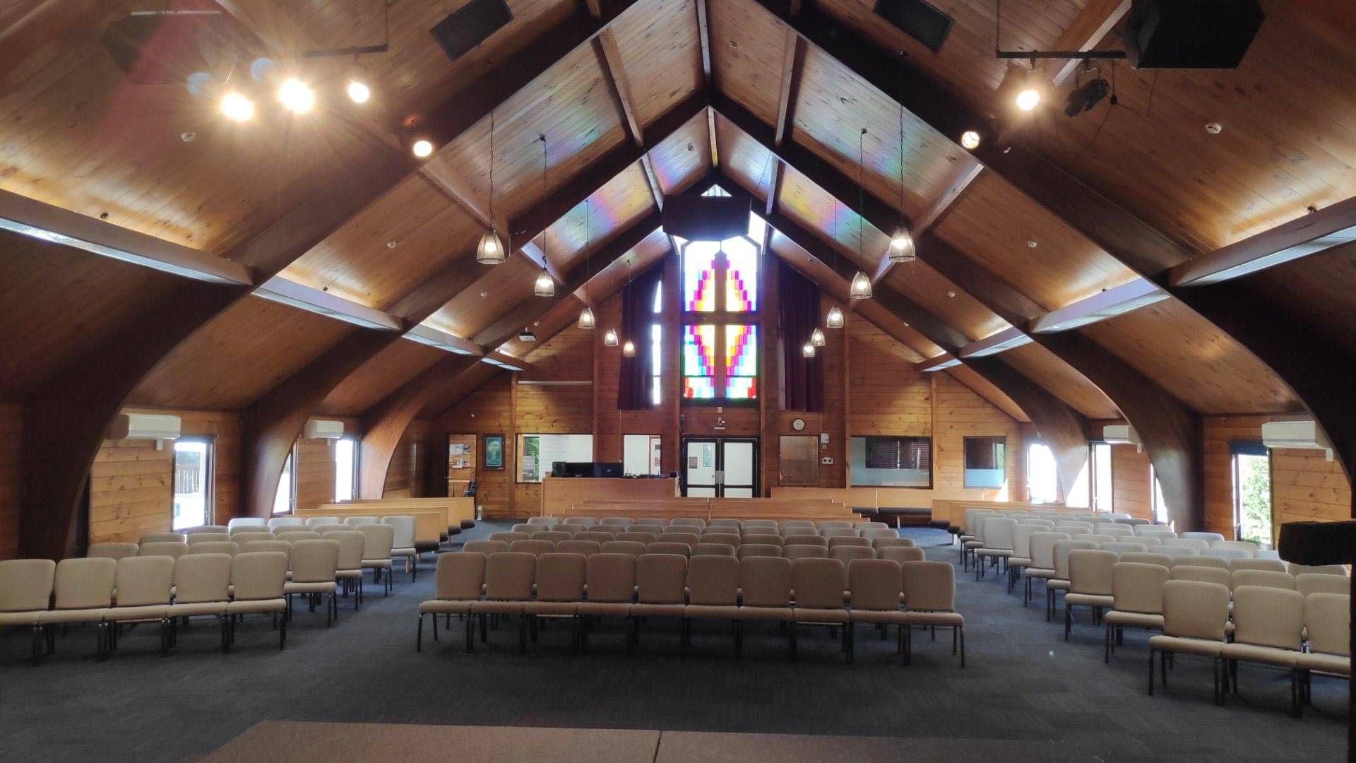 At the back of the Auditorium is a beautiful stained glass window which we light at night. There is direct external access into the Auditorium from the carpark, and direct access from the Auditorium onto our large deck at the back of the building (suitable for up to 100 people).