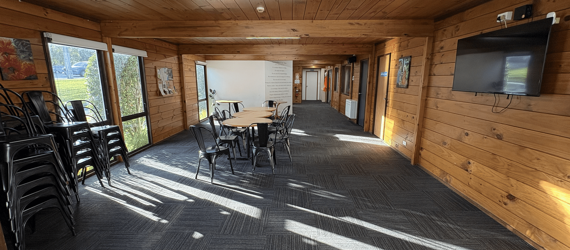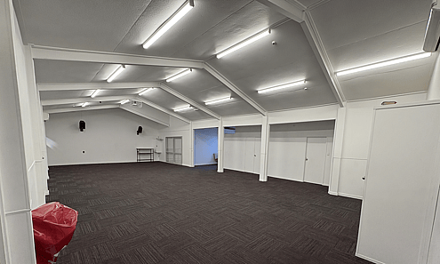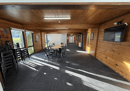 The Downstairs Hall is a smaller hall, appropriate for groups of up to 5o people and it has its own external access door from below our back deck. This room also has chairs and tables available for use and it has a built in kitchenette, perfect for serving nibbles and refreshments.