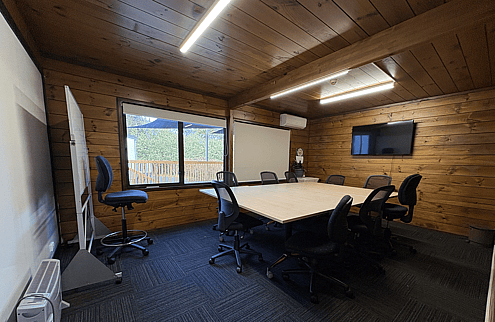 The Meeting Room fits approximately 12 people. It has three large tables and wheeled chairs in it, however, the tables fold upright and are on wheels to be pushed to the side, or can be removed if you would prefer. This room also has a TV mounted to the wall. Perfect for meetings or small group gatherings.